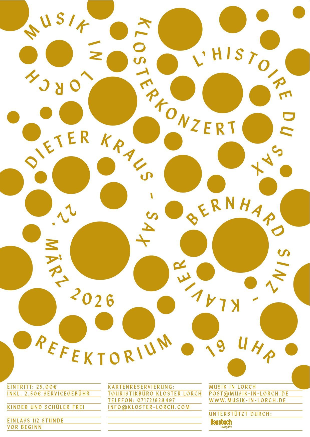 „L´histoire du Sax“ ist eine spannende musikalische Zeitreise mit Dieter Kraus am Saxophon und Bernhard Sinz am Flügel, in der die beiden Musiker auf den Pfaden von Adolphe Sax wandeln, der im Jahr 1840 das Saxofon erfand. Nachdem wir in den letzten Jahren in unserer Recital-Reihe von „Musik in Lorch“ im Refektorium schon die Geige, das Violoncello und auch den Kontrabass im Focus hatten, nehmen wir uns diesmal also das Saxophon vor. Beileibe nicht nur ein Instrument für den Jazz. Bei diesem „Sax Abend“ wird im Duo- Format eine musikalische Liebesgeschichte für das Saxofon aufgeblättert. Das gerade einmal knapp 200 Jahre Instrument hat in dieser Zeit eine spannende Entwicklung durchlebt. Musikalisch beleuchten Dieter Kraus und Bernhard Sinz einerseits die rein klassische Anfangszeit des Instruments, sowie auch die Zeit, in der sich das Instrument in verschiedenen Musikstilen etablierte…Eine Zeitreise für „jung und alt“.